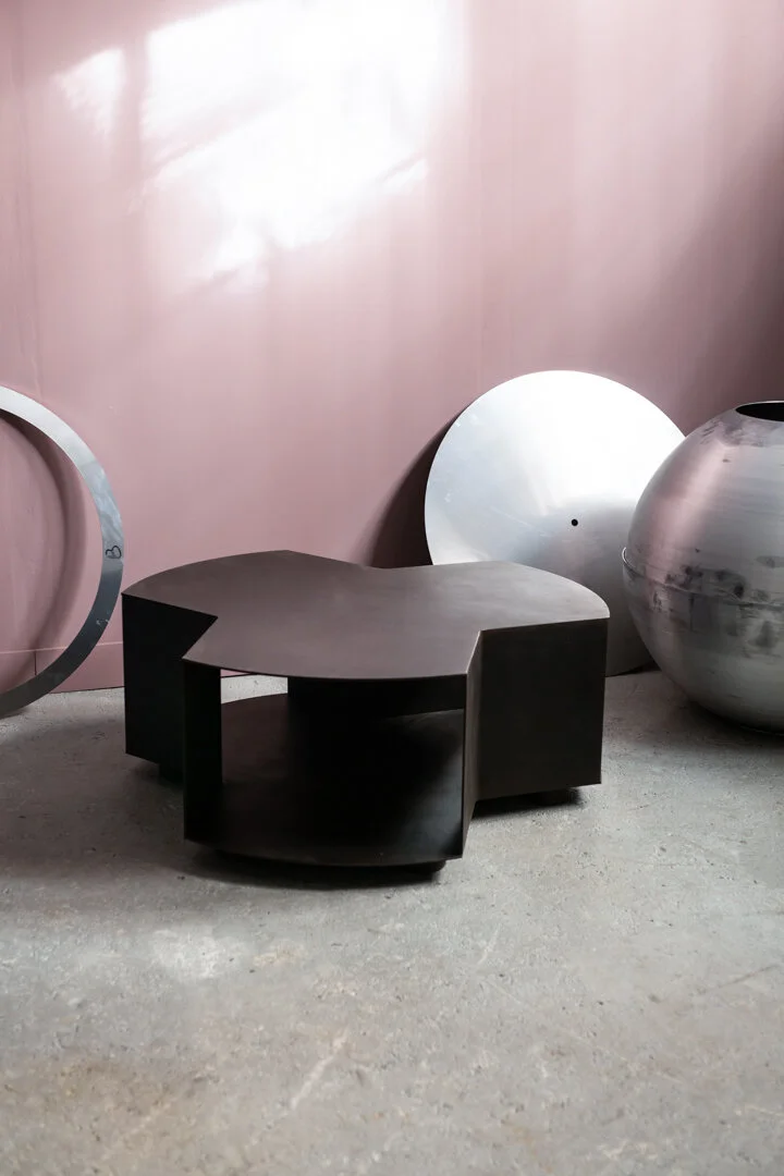 An exploration into architecture at the scale of furniture. The steel structure is given a hand-applied patina with a waxed finish. Adding warmth to an otherwise cold form that invites the viewer to visually pass through the negative void.