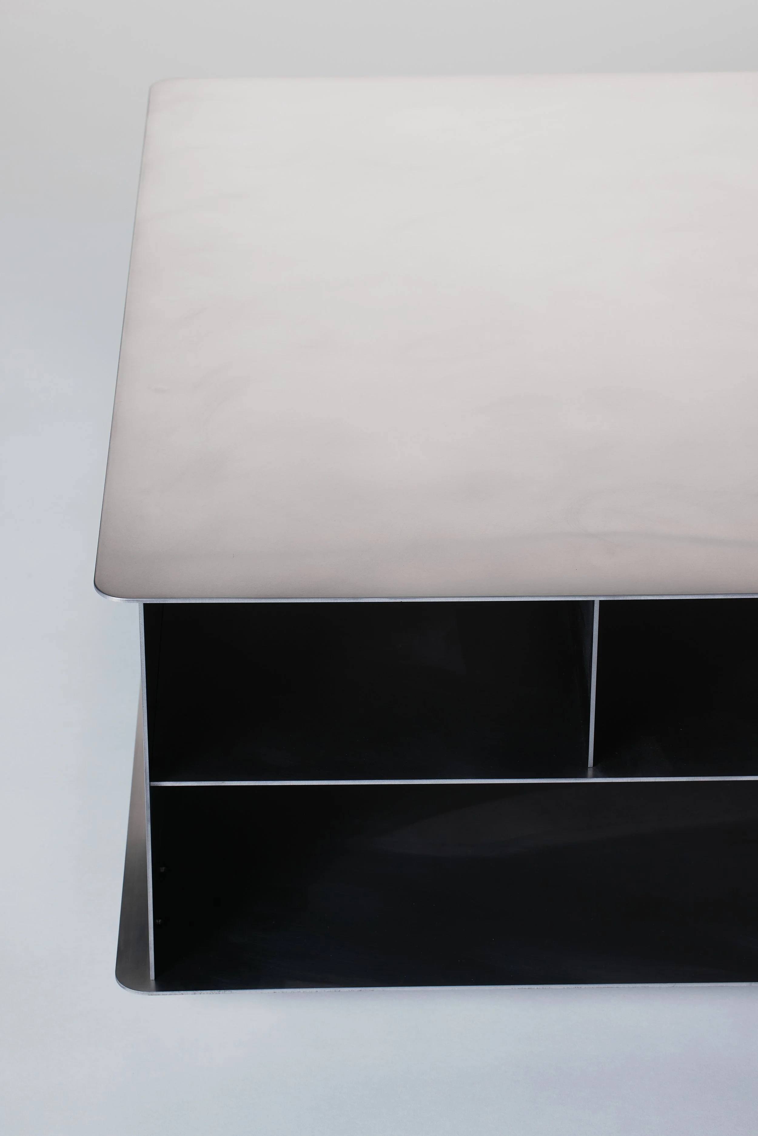 The Erebus Table embodies an interplay of strength and gentleness, merging robust industrial materials with softened corners. This amalgamation provides a blend of durability and elegance. Functional storage levels divide the internal space, allowing for a visually appealing organization. Pictured in hand-burnished stainless steel, the table can also be crafted in waxed aluminum, blackened steel, and burnished brass.